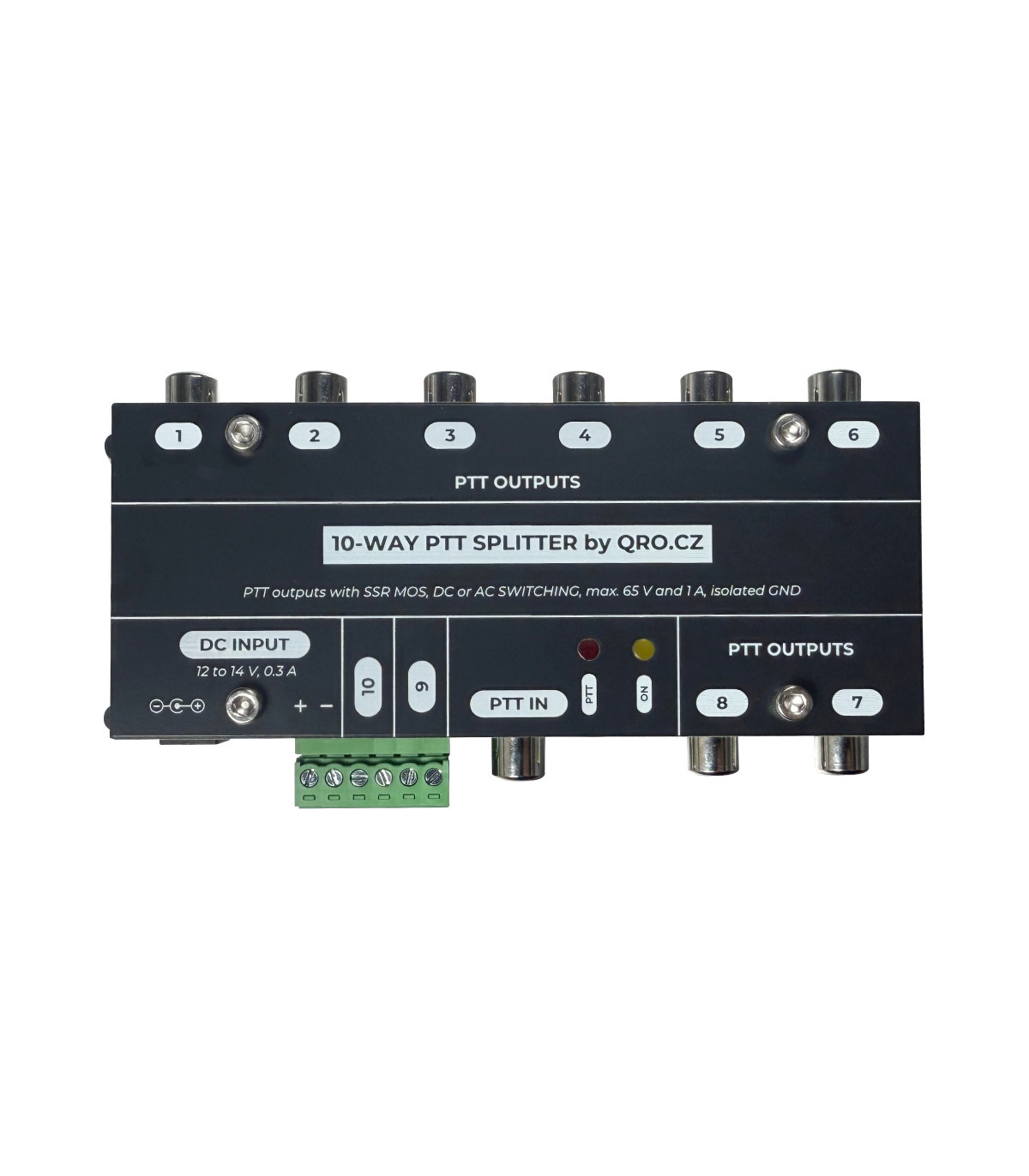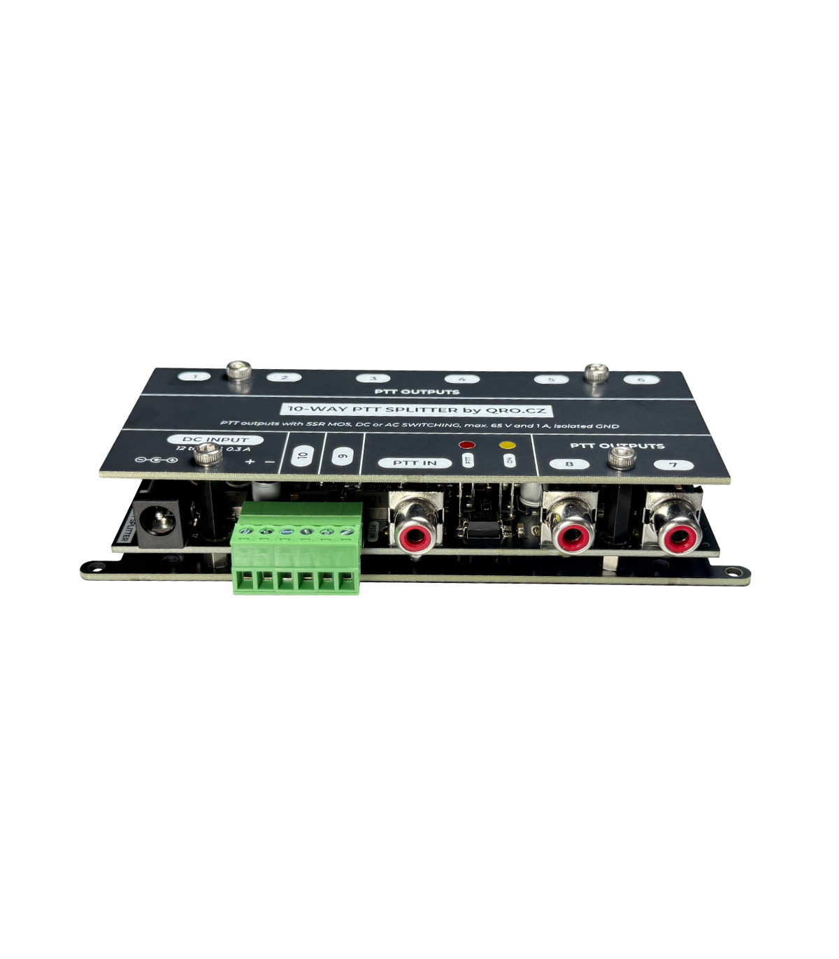 This splitter separates the source signal (TRX) from ten outputs. It also serves as protection. The outputs include RFI filters and surge protection up to 65V. Eight outputs are on classic RCA connectors and two are on a green screw terminal. These two contacts can also be connected in parallel to switch the PTT on some older PAs where there is high voltage in the open state (up to 130V).