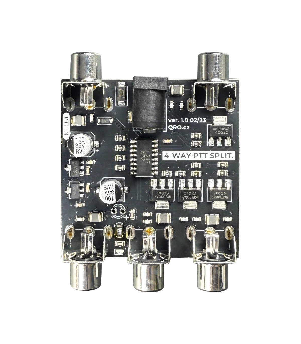 This 4-way PTT is a simply analog splitter. It's designed for no-delay PTT switching from one input to four outputs. You can split PTT signal to four independent devices. This device also protects your TRX PTT output from external accessories. There are optocoupler isolators between PTT input and all four PTT outputs.