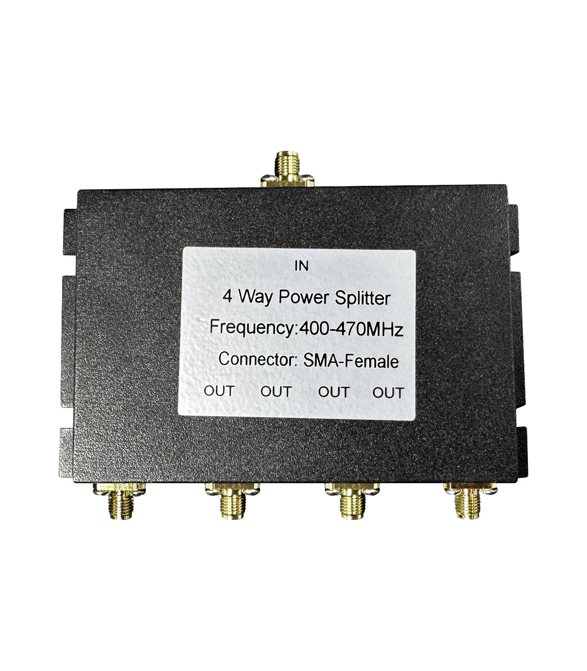 This is wide band multi stage four way Wilkinson power divider/combiner. To achieve a wide frequency range, the design consists of three stages. This gives a frequency range of 400 to 470MHz. Thanks to the design used, very good parameters are maintained over the whole range - see measurements. The microstrip line is realised on a special microwave PCB substrate.