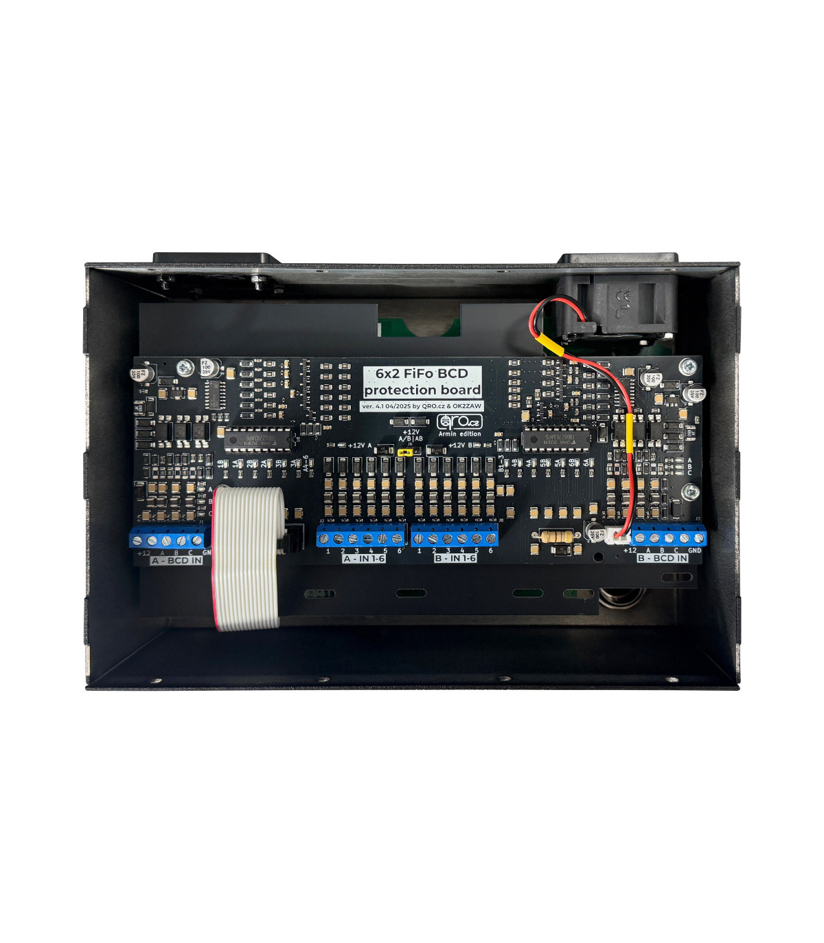 This is the indoor version of the popular RF switch six to two. The indoor version - IND-I - means that it is not waterproof and includes a fan with a dust filter. This version has a redesigned RF PCB with improved parameters. The overall design has been modified so that the switch can be easily disassembled for inspection or repair. The switch consists of an RF PCB, a shielding spacer, and a board with protective FiFo logic, BCD inputs, and RFI filters.