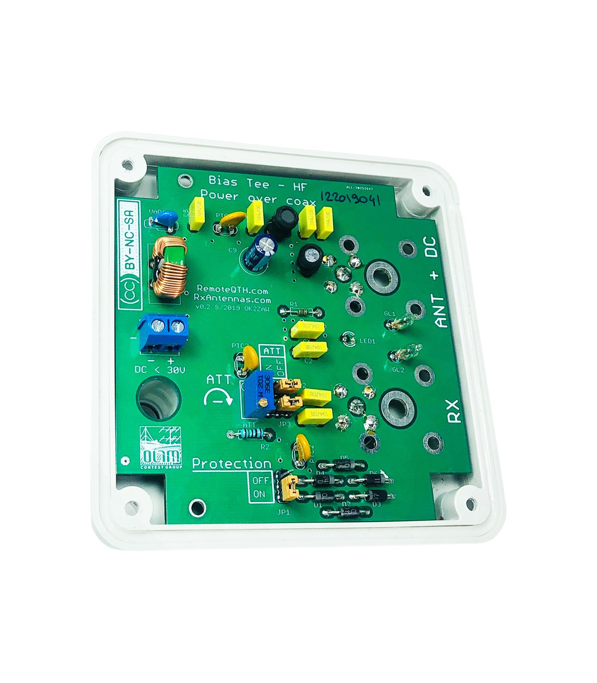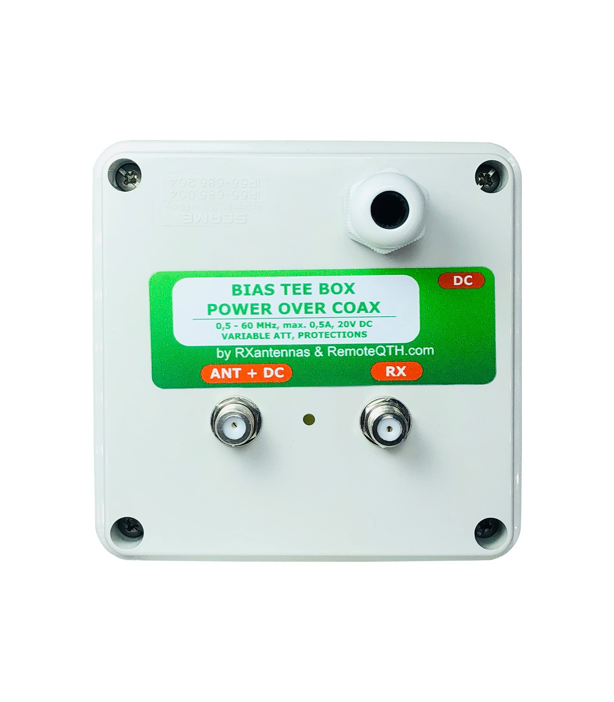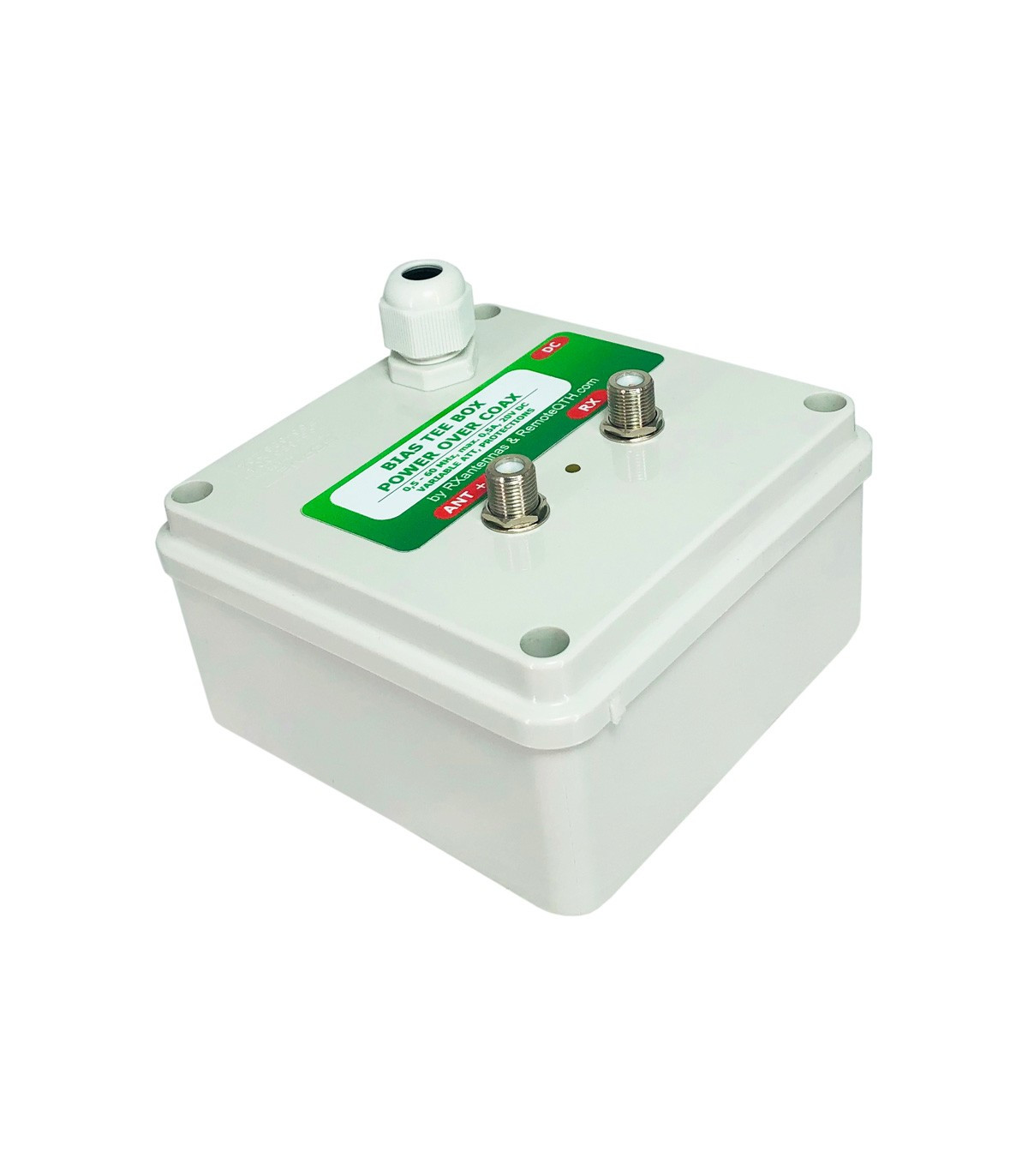 This bias tee box is used to insert DC power into an HF signal to power remote antenna amplifiers or other devices. It is usually positioned at the receiving end of the coaxial cable to pass DC power from an external source to the coaxial cable running to powered device. A bias tee consists of a feed inductor to deliver DC to a connector on the device side and a blocking capacitor to keep DC from passing through to the receiver. Bias tees are used in a variety of applications, but are generally used to provide an RF signal and (DC) power to a remote device where running two separate cables would not be advantageous.