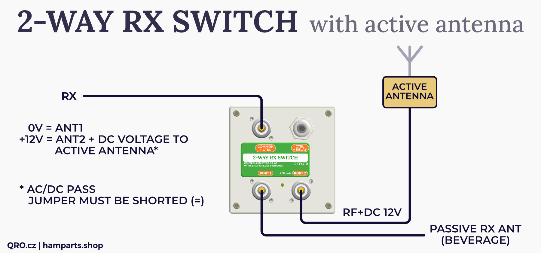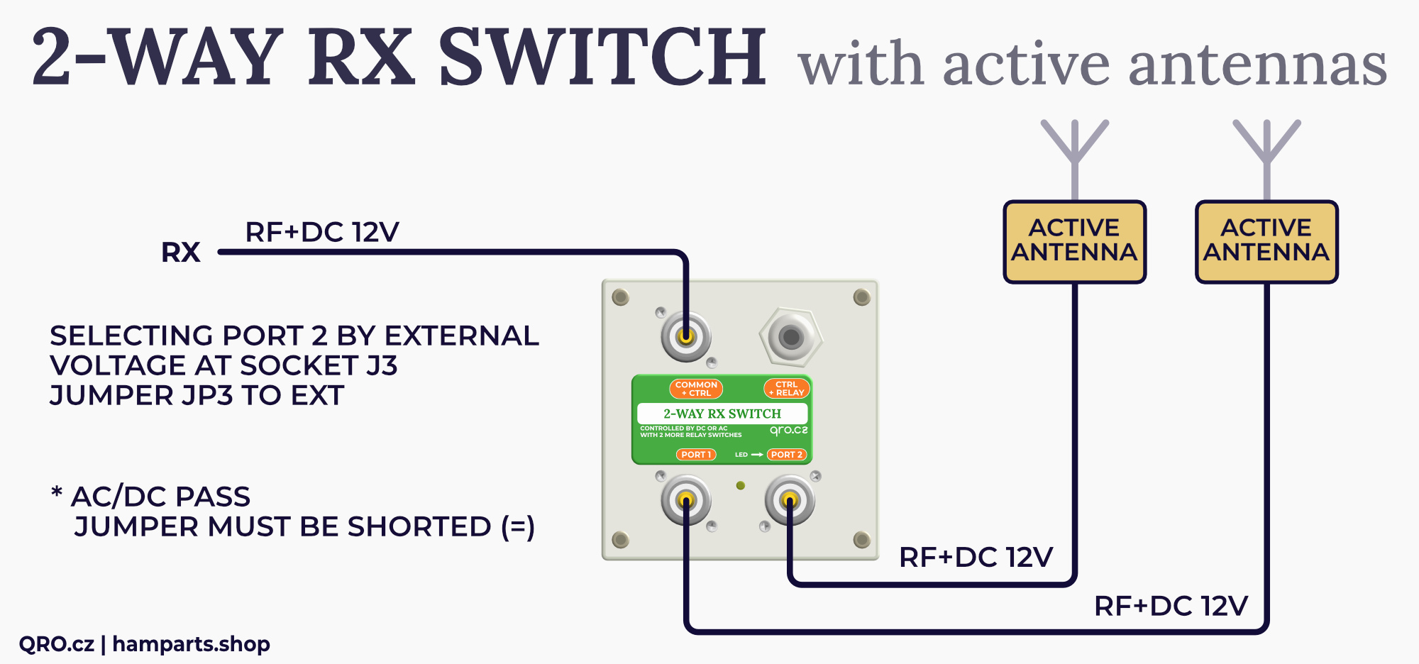 If there is one active antenna, you can connect it to Port 2, set the switch to DC+ (jumper JP3) and jumper JP1 on the right. Then, after supplying +12V over the coaxial cable from the RX, the 2-way RX switch (indicated by the LED) and the voltage will continue through Port 2 to the active antenna. This will only feed and amplify the antenna when the switch is flipped.
