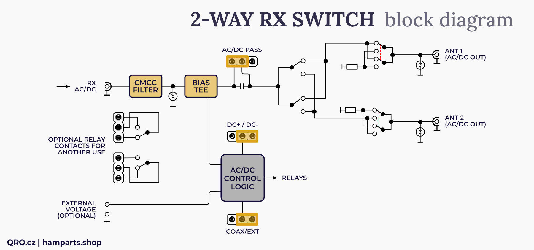 This is 2-way switch for RX system. It allows you to switch two RX RF signals from two inputs to one output. The unused input is loaded with an internal dummy load. There are several ways and signals to control the switch. It can be switched by voltage over coaxial cable, external signals and also use two relay contacts to switch other signals - preamp power, audio path, etc.