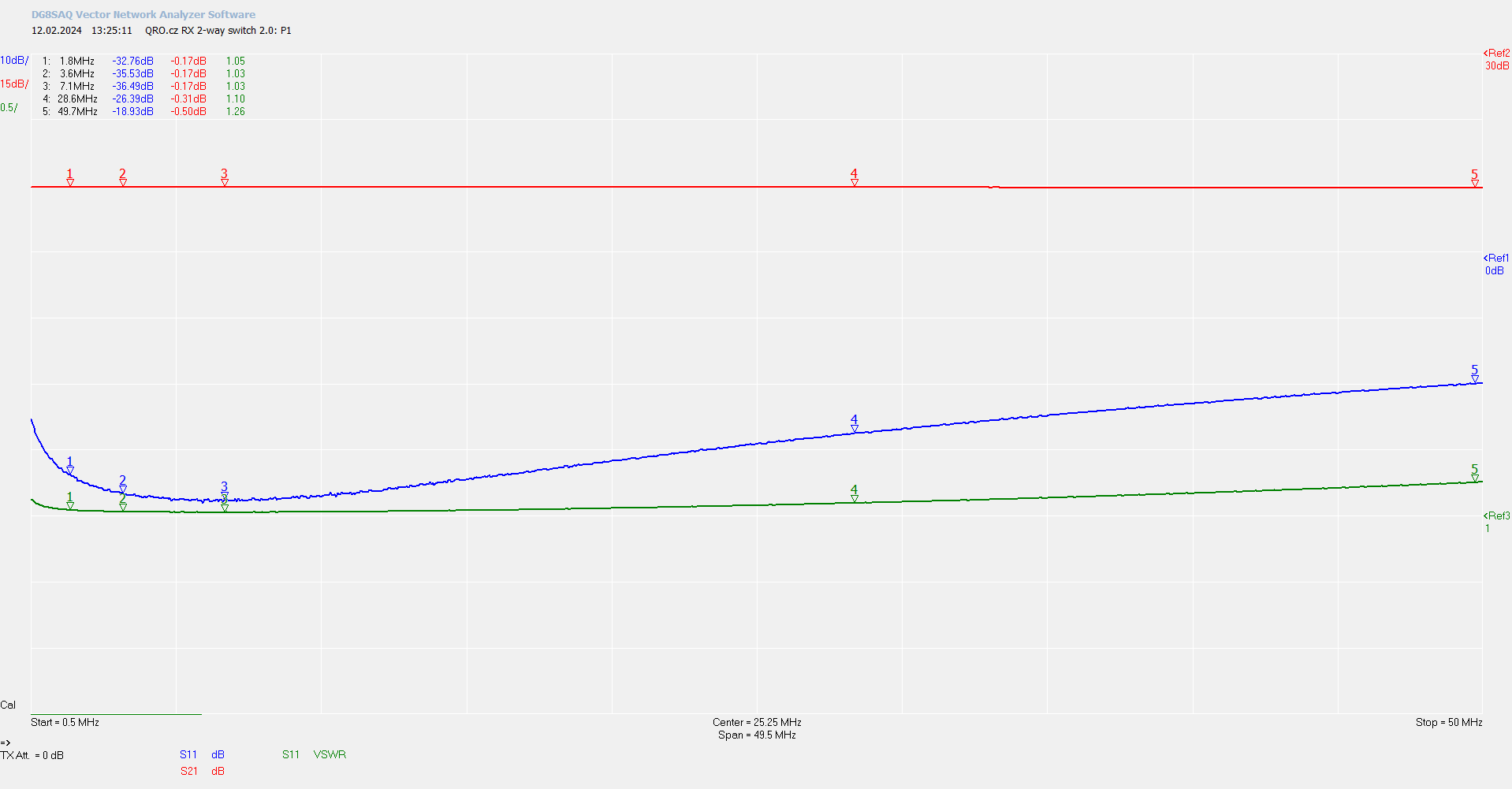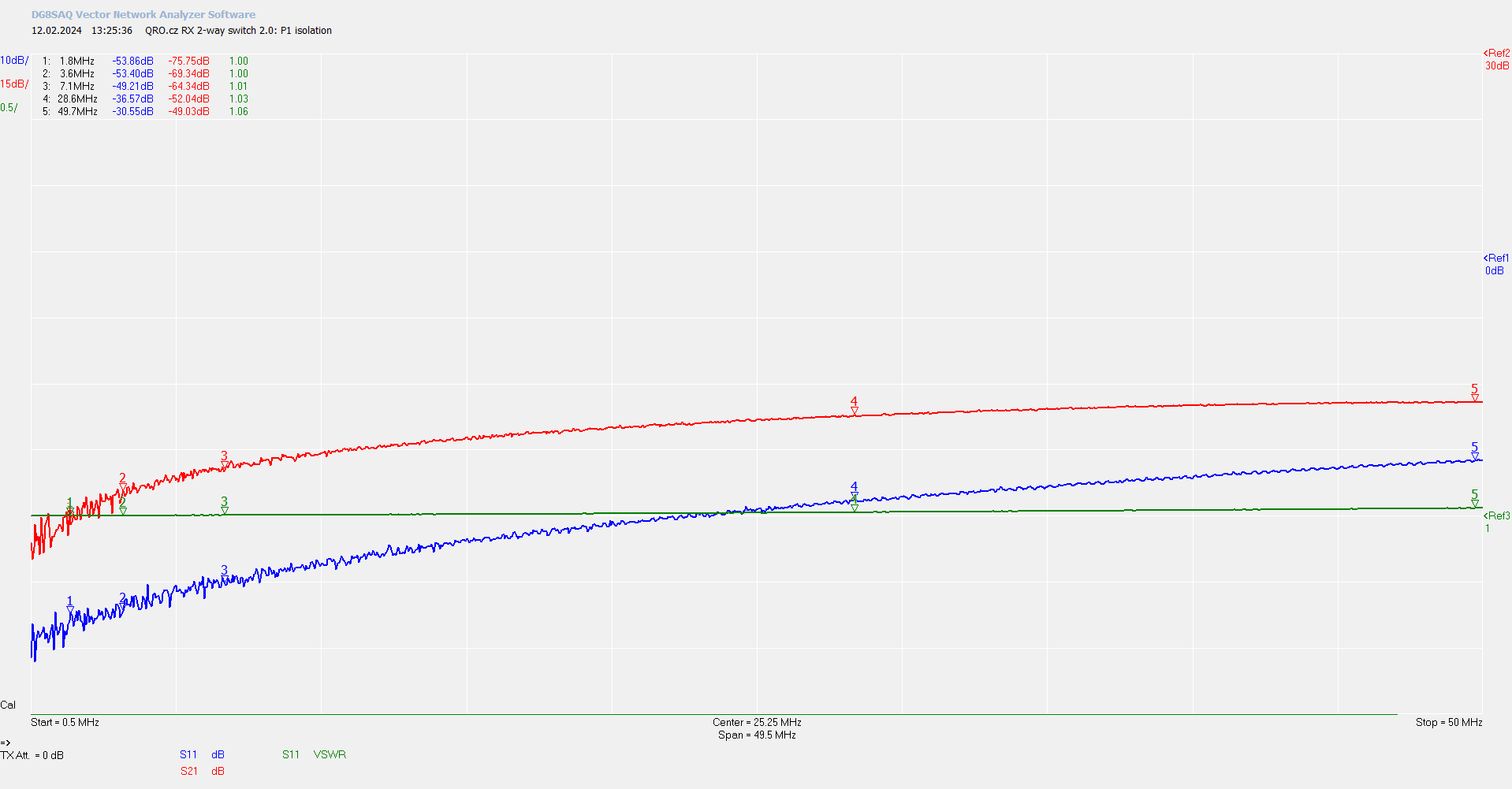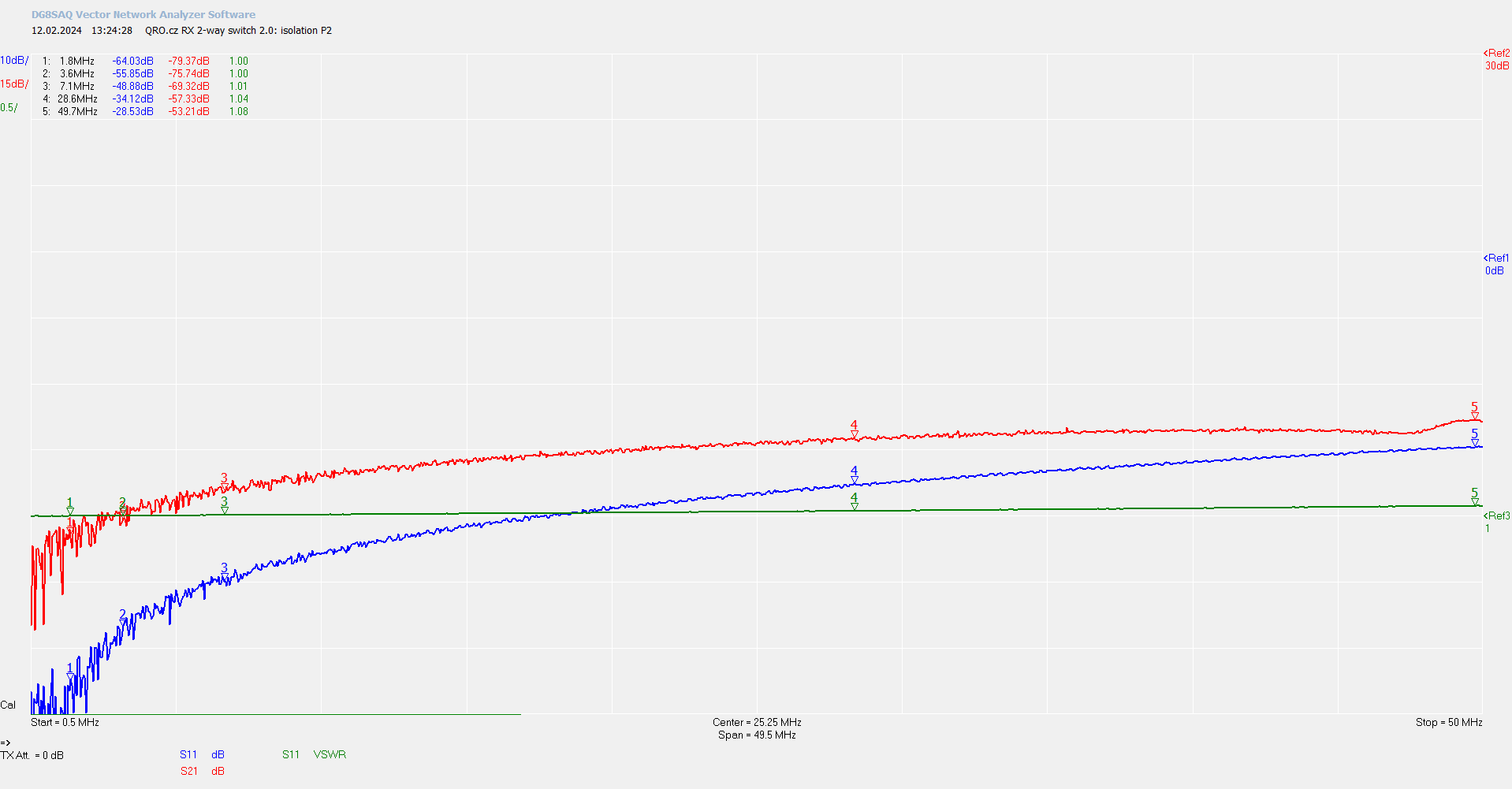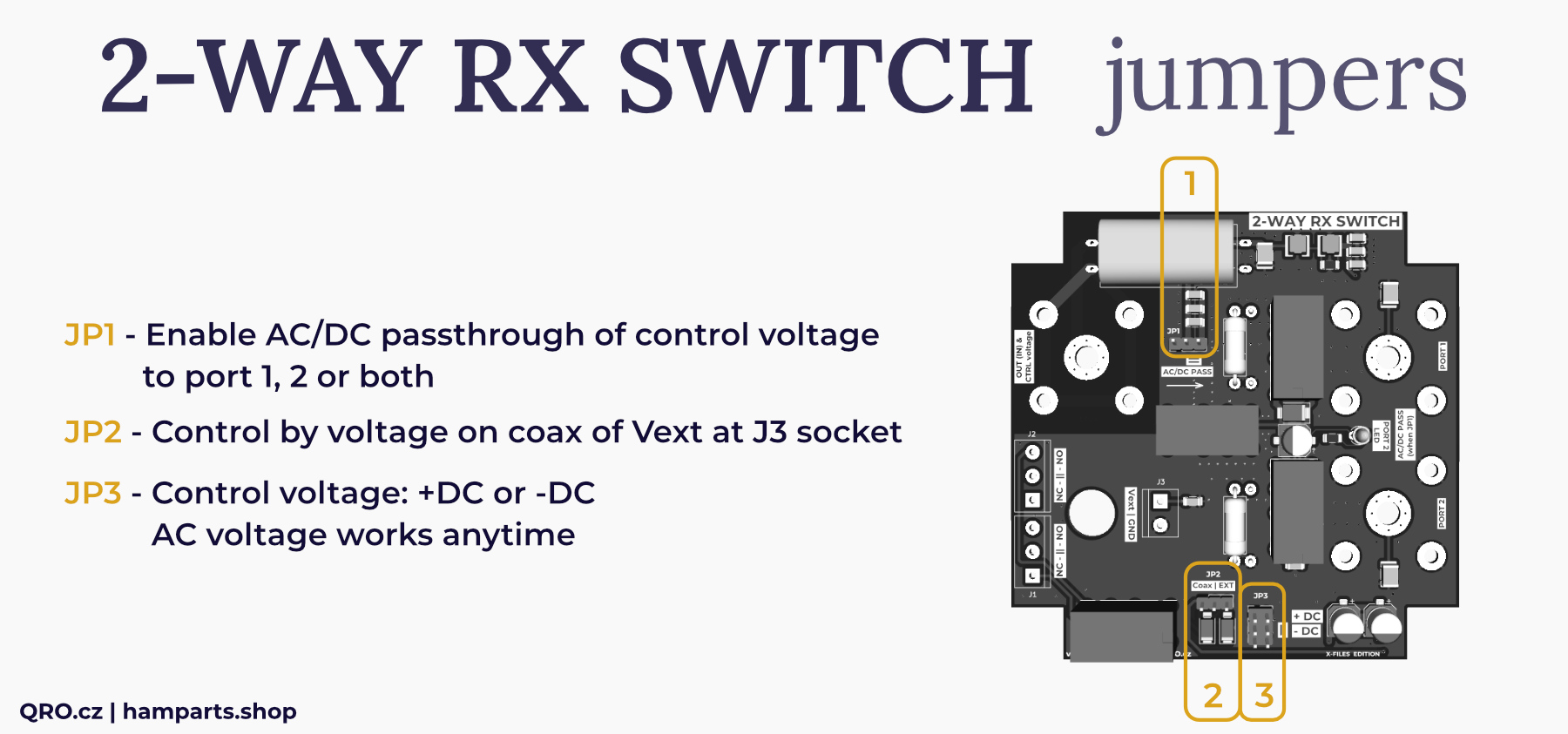 When JP1 is in left position, there is AC/DC blocking and there is no voltage at port 1 or 2. Anyway you have to count with some AC „noise“ voltage which can go over blocking capacitor. When you use Receivers at port 1 and 2 and control 2-way switch by AC, please do not use SDR without band pass filters or use high pass filter 10kHz+ to protect SDR from AC noise.