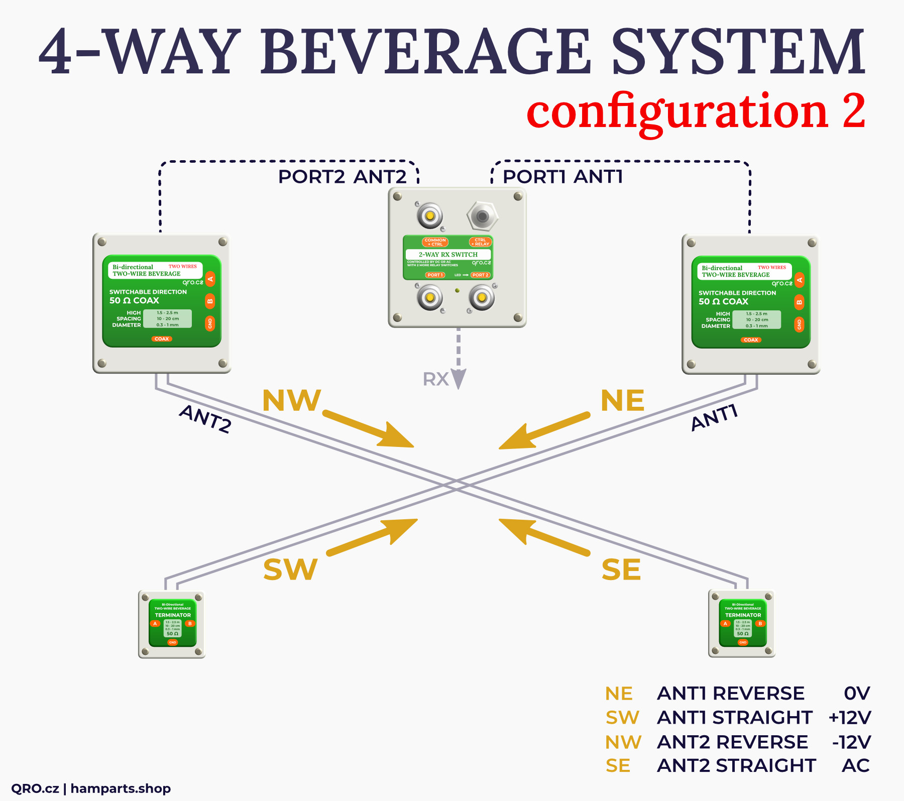This configuration is very important. Although beverage antennas can be placed in different ways, the control voltage remains the same. Therefore, the jumpers in the controller must be interconnected. This ensures that the direction indicator corresponds to the correct routing of the antennas.
