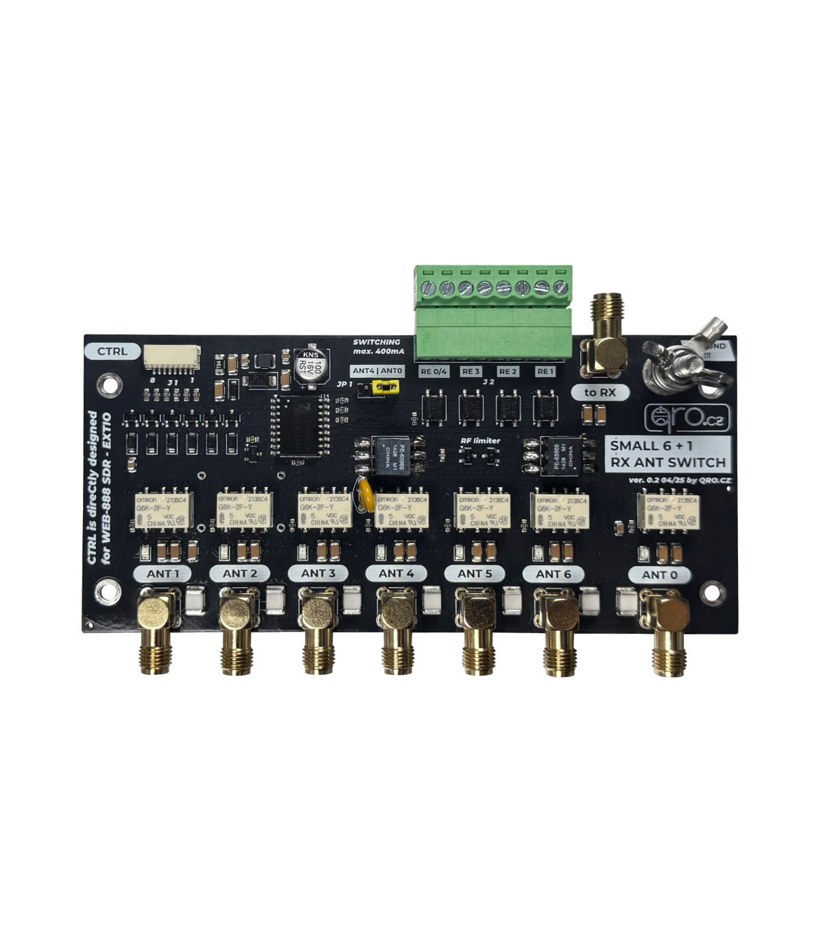 This antenna switch module was developed for direct connection to the WEB-888 SDR. From the web interface of this SDR, it is possible to easily switch between 6 antennas. Of course, the switch can also be connected to another IP relay or rotary switch. For more information, see the manual.