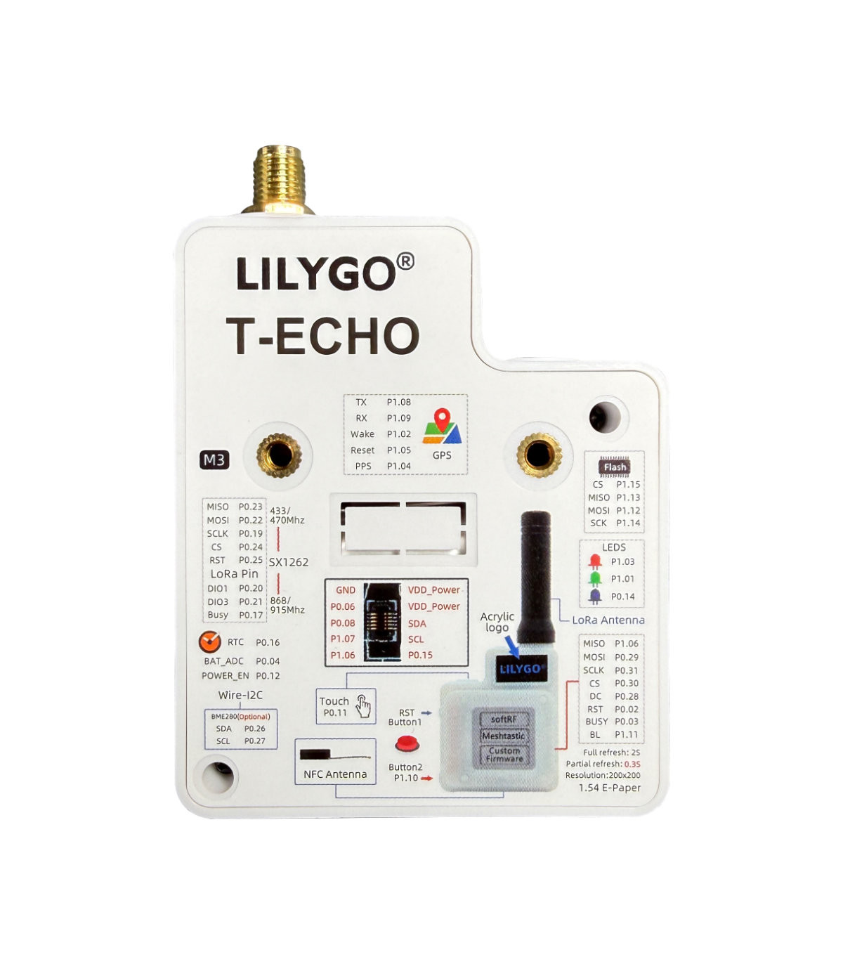 This is original Lilygo T-Echo with E-Paper display. This version T-Echo offers not only 1.54 inch display with 200x200 resolution, SX1262 LoRa transceiver, 2.4 GHz Bluetooth, Zigbee, NRF52840 core, but also built-in L76K GPS module and 850 mAh battery. The device allows you to connect external devices to buses such as: UART, SPI, etc. Please, select right frequency version before your order. This is version withou BME280 sensor.